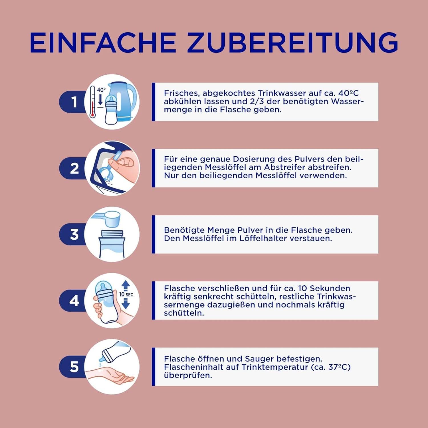 Befolgen Sie bei der Zubereitung von Aptamil Profutura DUOADVANCE 2 sorgfältig die Gebrauchsanweisung. Bei unsachgemäßer Zubereitung und Lagerung kann es zu gesundheitlichen Problemen durch das Wachstum unerwünschter Keime kommen. Bereiten Sie vor jeder Mahlzeit frisches Futter zu und füttern Sie es sofort. Essensreste nicht wiederverwenden. Reinigen Sie Flasche, Sauger und Ring gründlich. Erhitzen Sie die Formel nicht in der Mikrowelle (Überhitzungsgefahr). 1 Lassen Sie das frisch abgekochte Trinkwasser auf ca. 40°C abkühlen und geben Sie 2/3 der benötigten Wassermenge hinzu. 2 Für eine präzise Pulverdosierung wischen Sie den mitgelieferten Messlöffel am Rakel ab. Verwenden Sie ausschließlich den mitgelieferten Messlöffel. 3 Geben Sie die erforderliche Menge Pulver in die Flasche. Bewahren Sie den Messlöffel im Löffelhalter auf. 4 Verschließen Sie die Flasche und schütteln Sie sie etwa 10 Sekunden lang kräftig vertikal, gießen Sie die restliche Menge Trinkwasser ein und schütteln Sie sie erneut. 5 Öffnen Sie die Flasche und befestigen Sie den Sauger. Überprüfen Sie den Flascheninhalt auf Trinktemperatur (ca. 37°C). DOSIERUNG UND ZUBEREITUNG: Die Anzahl der Flaschen und Trinkmengen sind Richtwerte und können von Person zu Person variieren. Für 1 Löffel Pulver benötigen Sie 30 ml Wasser. Vollständig enthält ein Messlöffel 4,8 g. Alter des Kindes: nach 6 Monaten, Flaschenmahlzeiten pro Tag 1-3, trinkfertige Lebensmittel (ml) 230, pro Mahlzeit erforderlich: Wasser in ml 210, Messlöffel 7. Alter des Kindes: nach 6 Monaten, Flaschenmahlzeiten pro Tag 1-3, trinkfertige Lebensmittel (ml) 200, pro Mahlzeit erforderlich: Wasser in ml 180, Messlöffel 6. Alter des Kindes: nach dem 6. Monat, bei kleineren Mengen dazu Getränk: Fertiggetränkenahrung (ml) 170, Pro Mahlzeit benötigt: Wasser in ml 150, Messlöffel 5. Alter des Kindes: ab dem 6. Monat, für kleinere Trinkmengen: trinkfertige Nahrung (ml) 130, pro Mahlzeit benötigter Bedarf: Wasser in ml 120, Messlöffel 4. Alter des Kindes: ab dem 6. Monat, für die Kleinsten Trinkmengen: trinkfertige Nahrung (ml) 100, Bedarf am Tisch: Wasser in ml 90, Messlöffel 3 Babys brauchen ca. 5 Mahlzeiten am Tag. Bei jeder Beikostmahlzeit muss eine Mahlzeit aus der Flasche ersetzt werden.