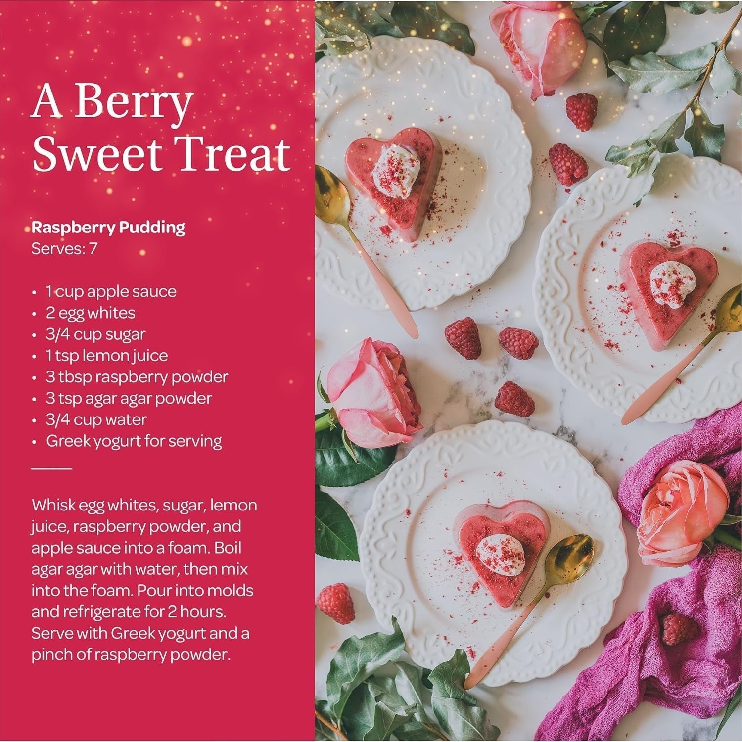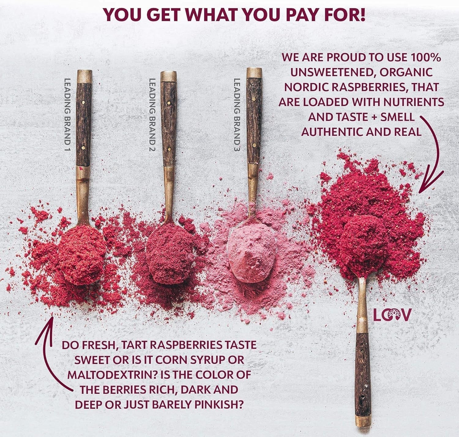 - Die Bio-Beeren von LOOV werden im Ganzen gefriergetrocknet, wodurch das Himbeerpulver reich an Geschmack, Farbe und Nährstoffen ist. Kleine Menge, große Wirkung: Geben Sie einfach einen Löffel süß-saures Himbeerpulver in Ihren Lieblings-Smoothie, Haferflocken, Müsli, Chia-Pudding oder verwenden Sie gefriergetrocknetes Himbeerpulver zum Backen