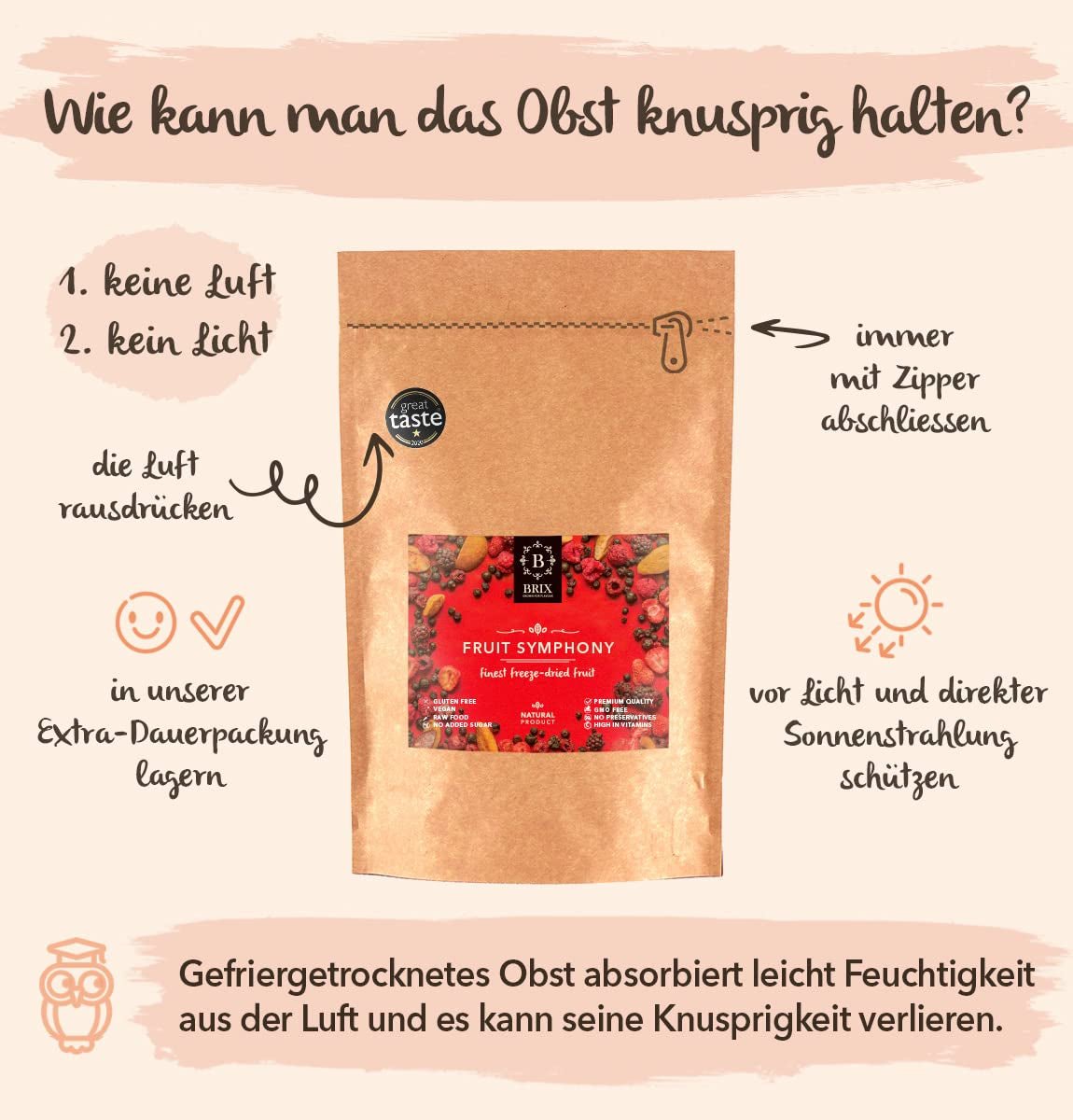 - GUTE VITAMIN- UND MINERALSTOFFQUELLE – Unsere gefriergetrockneten Früchte sind eine ausgezeichnete Vitaminquelle und enthalten Vitamin C, Antioxidantien, Mineralien und Ballaststoffe. 8 g unserer gefriergetrockneten Früchte sind eine der 5 empfohlenen Portionen Obst und Gemüse pro Tag. Köstliche gefriergetrocknete Früchte – Ob gefriergetrocknete Früchte schmecken oder nicht, hängt von der Qualität der verwendeten frischen Früchte ab. Wir bieten ausschließlich Obst an, das traditionell von Kleinbauern angebaut, reif geerntet und innerhalb von zwei Stunden nach der Ernte verarbeitet wird. Aus diesem Grund wurden 19 unserer Produkte mit einem „Great Taste Award“ ausgezeichnet. PRAKTISCHE ERFOLGREICHE TASCHE – Gefriergetrocknete Früchte sind in der versiegelten Verpackung lange haltbar und bleiben dadurch trocken und frisch.