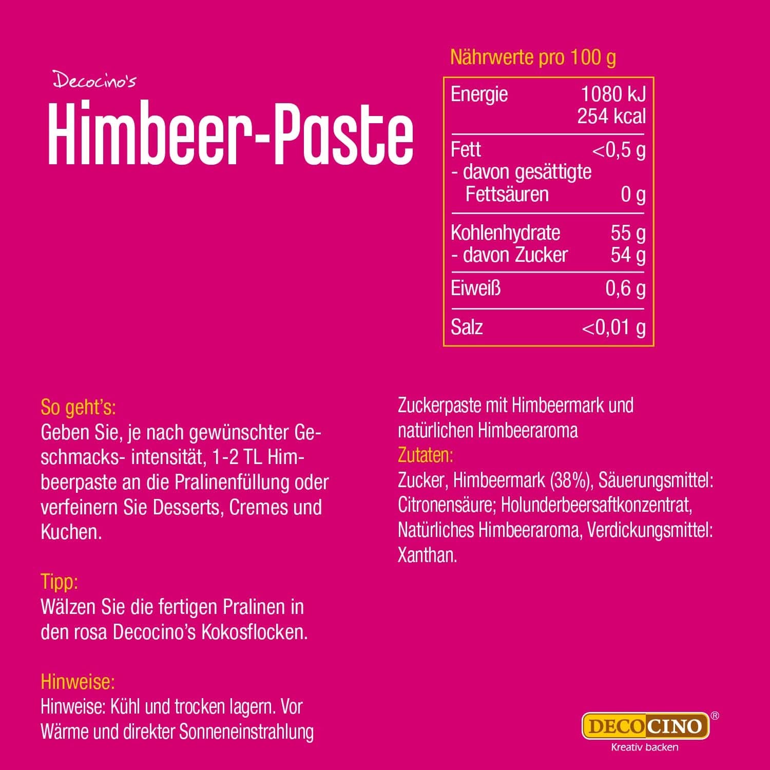 Aromapaste zum Verfeinern von Teig, Schokolade und Backwaren. DECOCINO Himbeerpaste – 50g – Backgeschmack mit natürlichem Himbeergeschmack, zum Verfeinern von Schokolade, Desserts und Kuchen – gebrauchsfertig und vegan