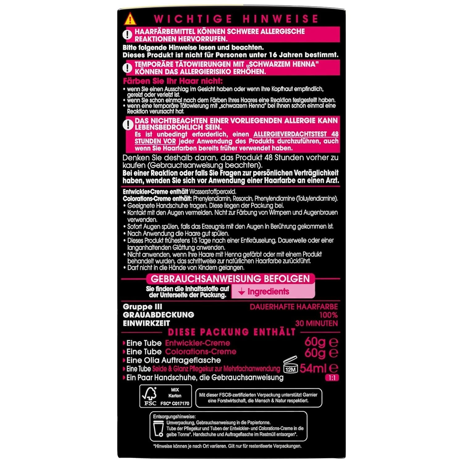 - Lieferumfang: 3x Garnier Olia Permanent Coloration, inkl. Färbecreme, Entwicklungscreme, Haarkur für mehrere Anwendungen, Einweghandschuhe, 1x Gebrauchsanweisung, Farbe: 10.32 Platingold (blond)