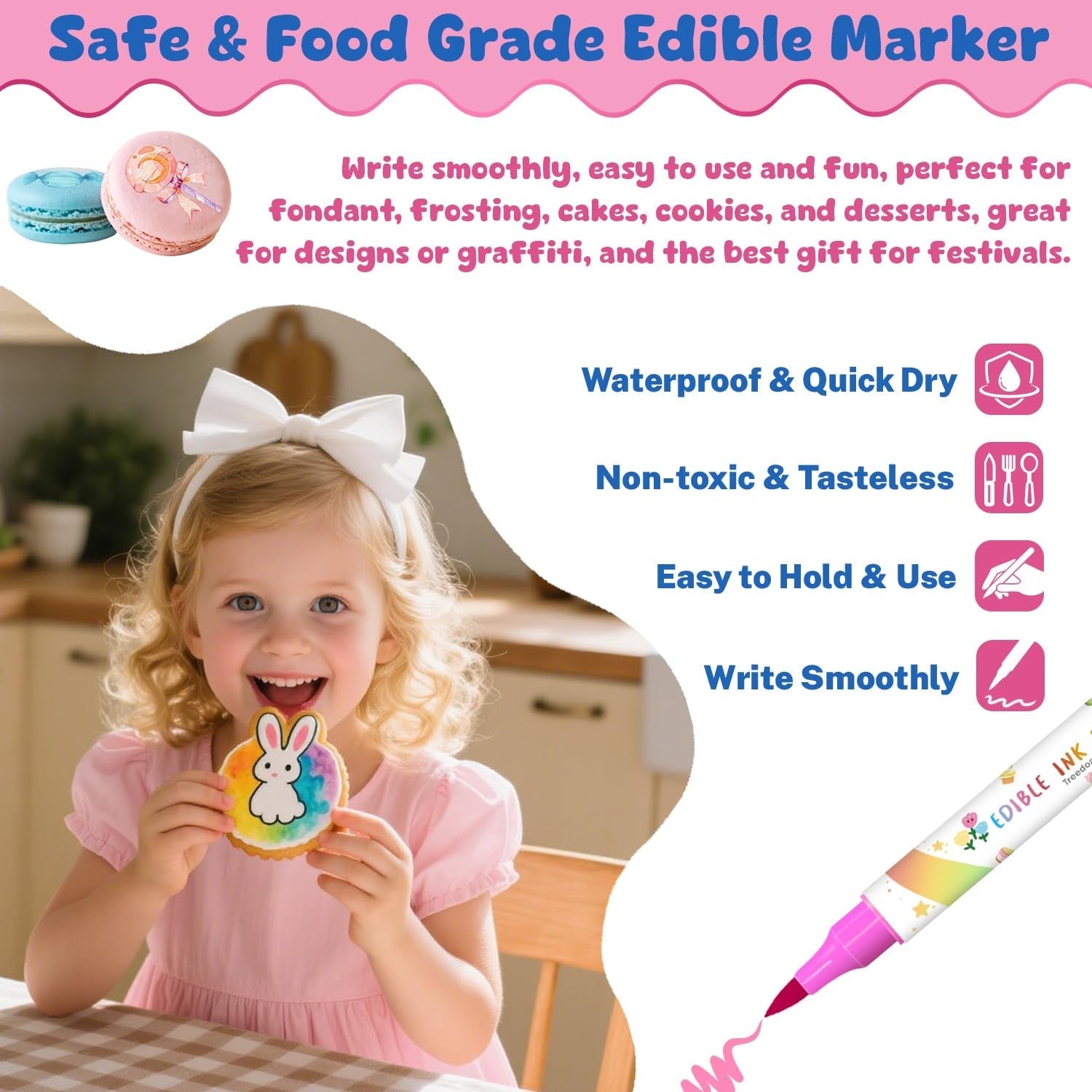 • Versatile, potrivite pentru numeroase suprafețe comestibile: Aceste markere comestibile sunt extrem de versatile și pot fi folosite pentru a decora o varietate de suprafețe comestibile netede și uscate - inclusiv fursecuri, fondant, produse de patiserie, ciocolată albă, glazură, prăjituri, ouă de Paște, gogoși, bezele, fructe și legume - și pot satisface toate nevoile dumneavoastră creative de decorare a alimentelor.