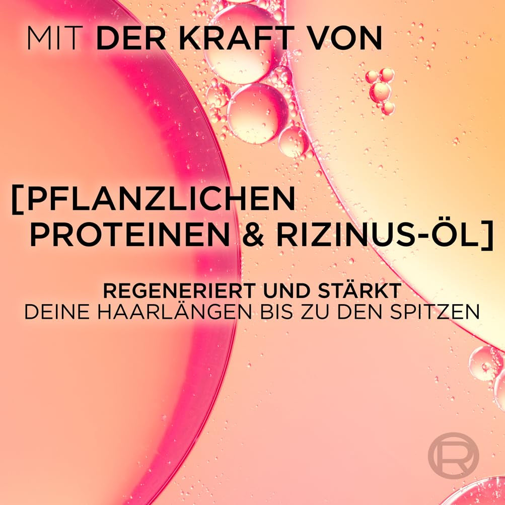 Pflanzenproteine, Vitamine und Rizinusöl: repariert das Haar bis in die Spitzen, stärkt das Haar, spendet Feuchtigkeit und verleiht dem Haar Glanz.