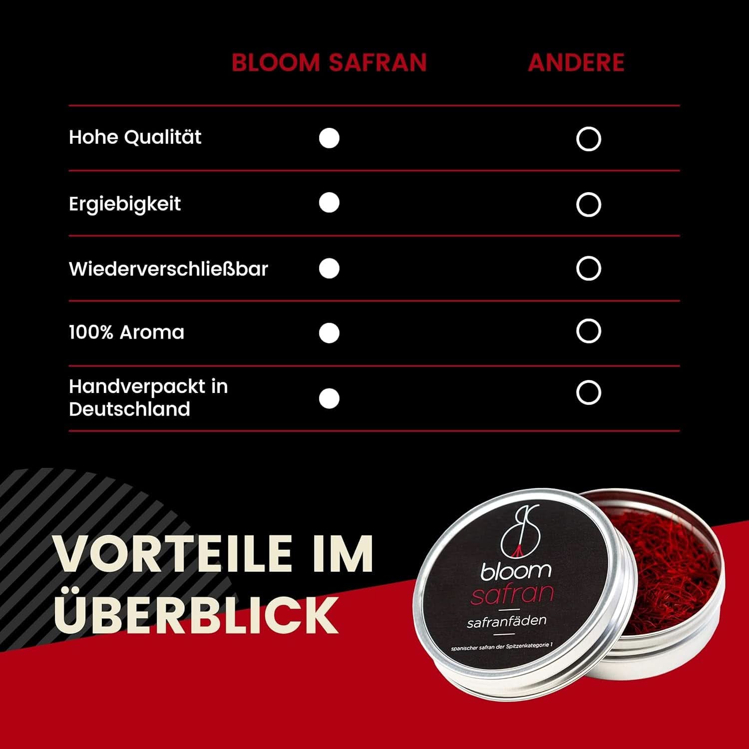 🇩🇪 HANDGEFERTIGT IN DEUTSCHLAND – Blütensafran wird in liebevoller Handarbeit in Deutschland verarbeitet und steht für höchste Qualität. Daher garantieren wir, dass unser Safran frei von künstlichen Aromen, Farbstoffen und Geschmacksverstärkern ist