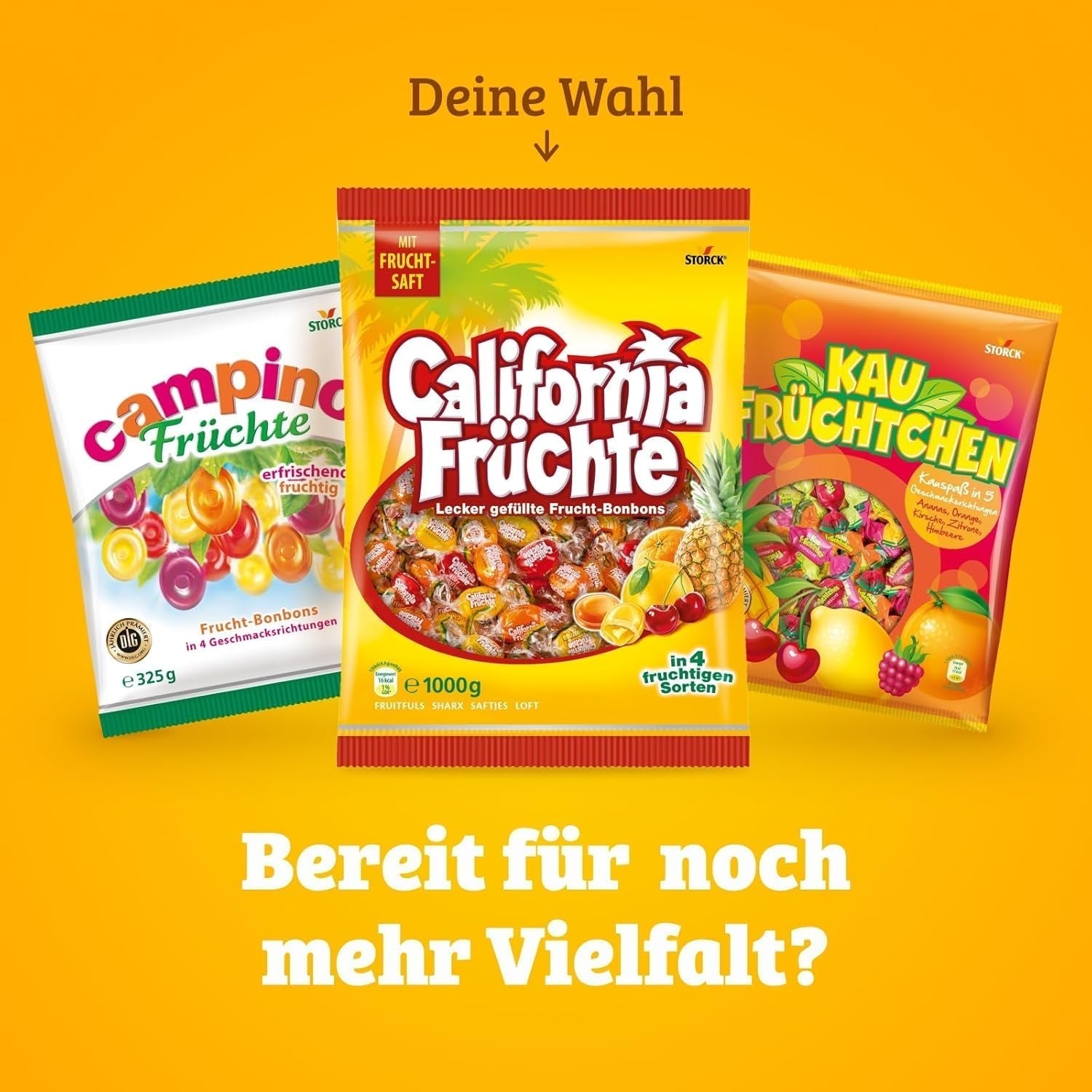 Lieferumfang: 1 x 1000 g kalifornische Frucht / Einzeln verpackte, mit Fruchtsaft gefüllte Bonbons / Großpackung / Ideal zum Teilen, Naschen und für unterwegs
