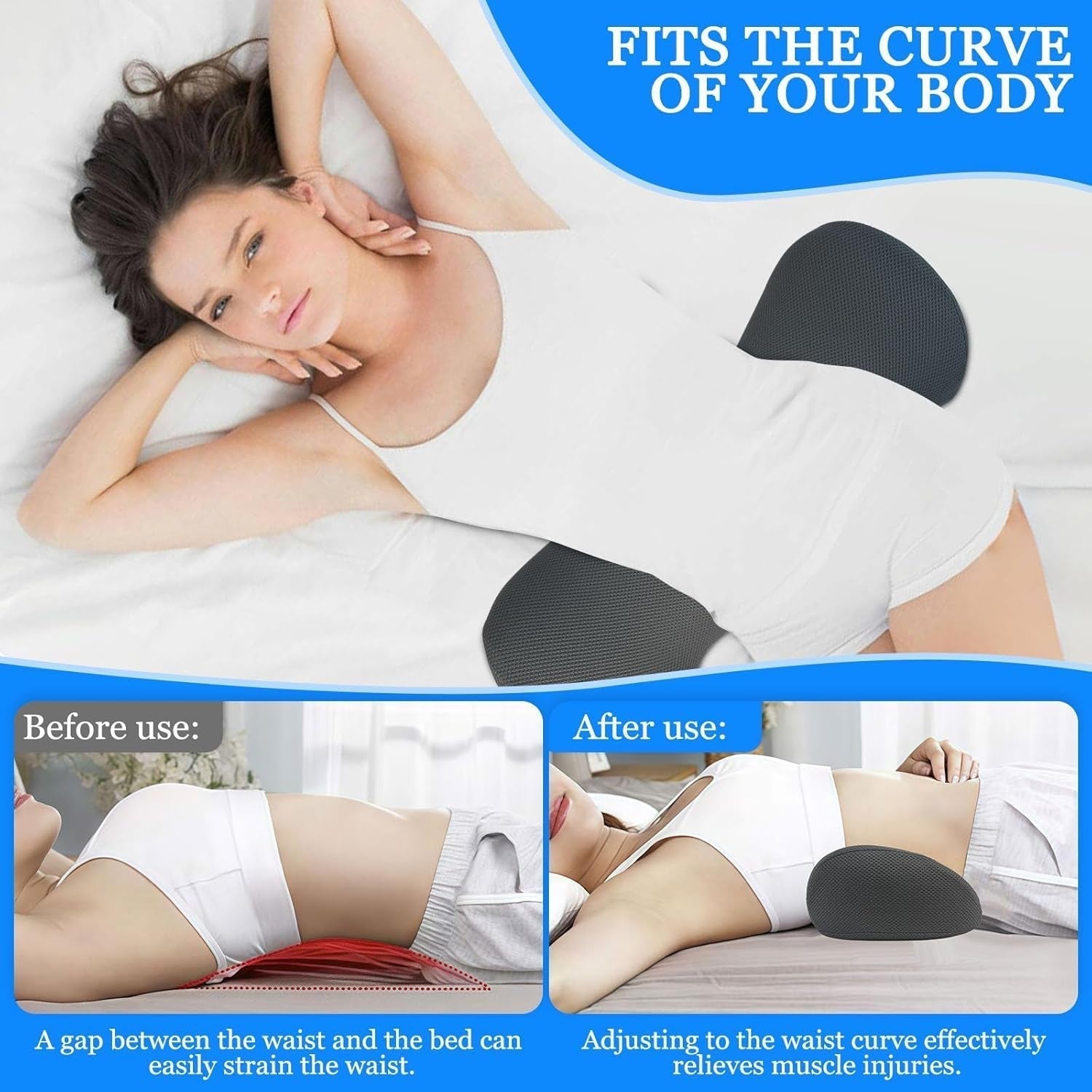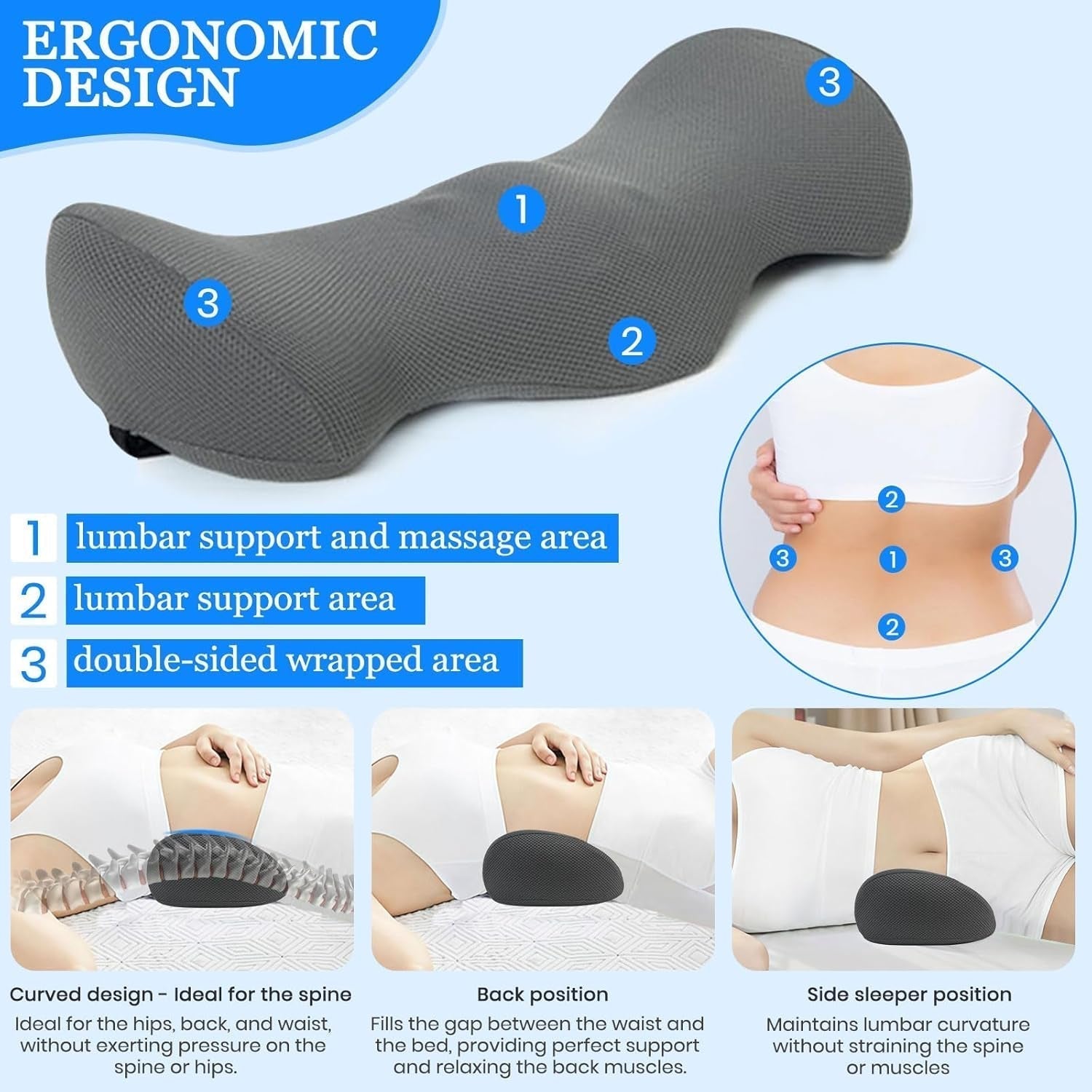 - ðŸŒ'Ergonomisches Lendenkissen: Das Lendenkissen ist ergonomisch gestaltet und verfügt über ein physikalisches Traktionsdesign, das die natürliche Krümmung der Lendenwirbelsäule unterstützt. Es füllt den Rückenbereich auf, in dem die Wirbelsäule eingesunken ist, und beugt Beschwerden durch längeres Liegen vor. Es sorgt für Komfort am ganzen Körper. ðŸŒ'ã...ã€Bequemes Lendenkissenmaterialã€'Das Lendenkissen besteht aus atmungsaktivem, hautfreundlichem Stoff und 100 % hochdichtem Memory-Schaum. Es kehrt innerhalb von 5 Sekunden langsam in seine Form zurück und sorgt für ein tiefes und erholsames Schlaferlebnis. Acht Massagepunkte helfen bei der Massage der Lendenwirbelsäule. Abmessungen: 54,5 x 24 x 11 cm.