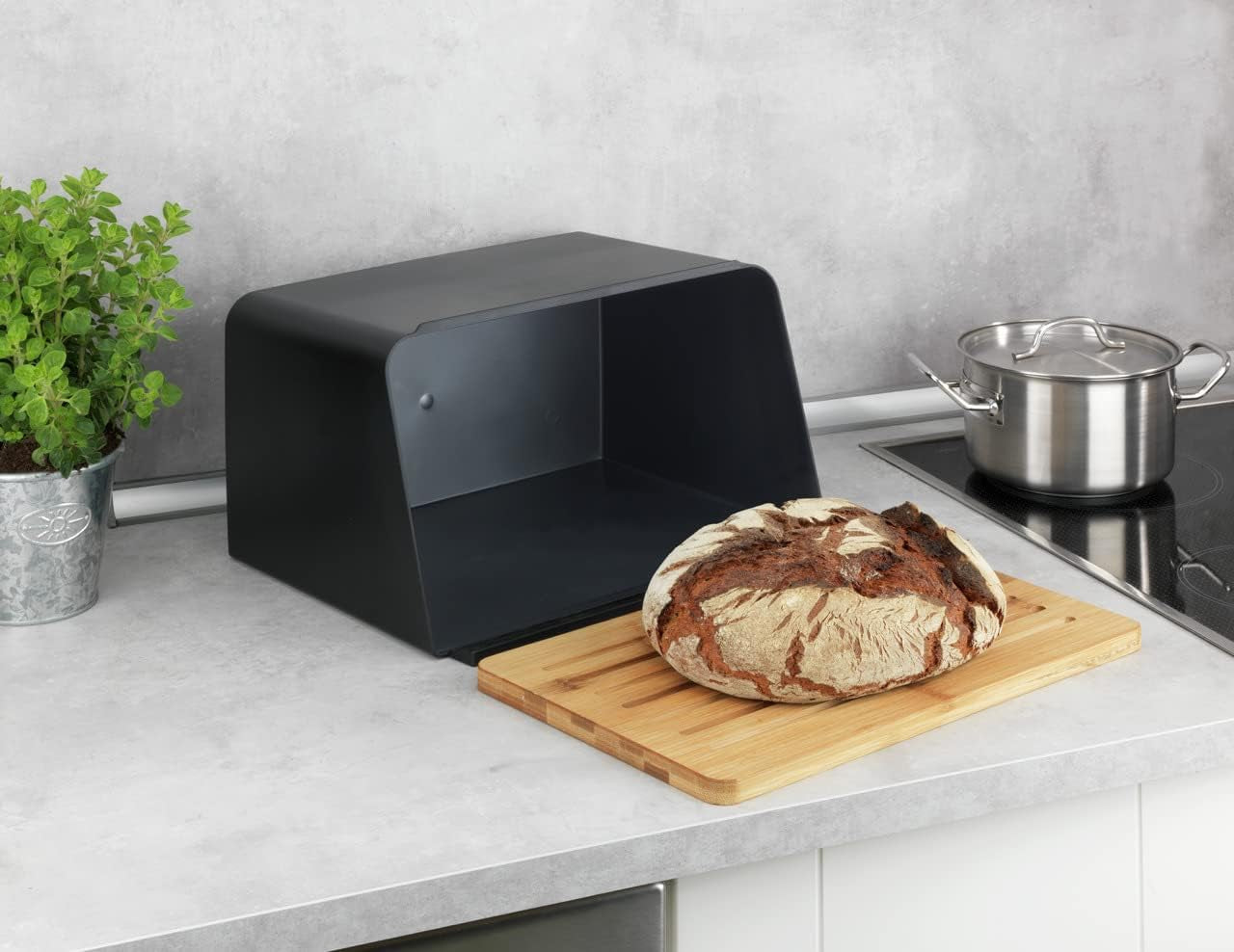 - Materialmix für Einrichtungstrends: Der Brotkasten Kubo von WENKO vereint trendige Farben mit hochwertigen Materialien und Multifunktionalität. Der Brotkasten aus schwarzem ABS-Kunststoff überzeugt in Kombination mit dem integrierten Bambus-Schneidebrett ungemein. Clever: Der Bambusteller dient auch als Tabletthalter, sodass Sie Ihre Rezepte immer im Blick haben. Nachhaltige Haushaltshilfe: Bambus punktet mit hohen Erträgen und geringer Umweltbelastung. Das rustikale Schneidebrett sieht toll aus, was es zu einem echten Hingucker macht und sich perfekt in Ihre Einrichtung einfügt. Das Schneidebrett ist ein wesentlicher Bestandteil jeder Küche. Außerdem verleiht der natürliche Look dem Raum sofort eine warme und natürliche Atmosphäre!